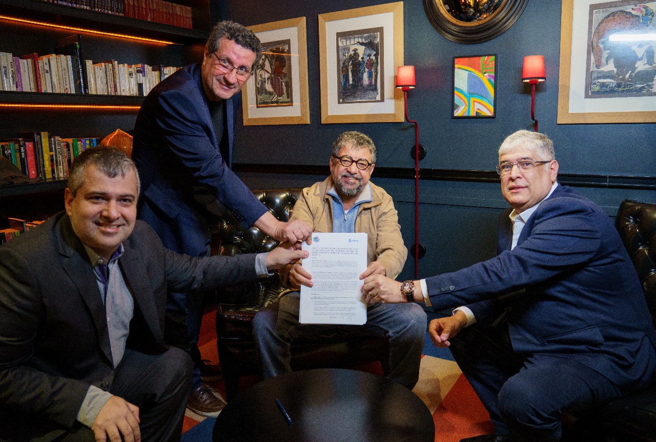 Na foto, Marcelo Velho (secretário de Saúde de Maricá), Claudio Gimenez (presidente do ICTIM), prefeito Washington Quaquá e Gustavo Oliveira do Amaral (presidente da FUSVE) Foto: Danillo Oliveira